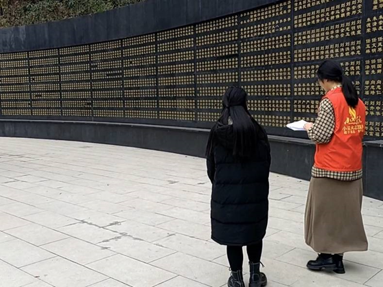 随后,成员们前行至烈士英名墙前。密密麻麻的名录令人联想到名录背后上那一位位敢于为祖国解放事业奉献一切的革命英烈。同学们追思缅怀先烈,久久盯着这一片名录,浏览先烈们的姓名,纷纷表示将永远铭记他们的牺牲,并向英烈们学习。