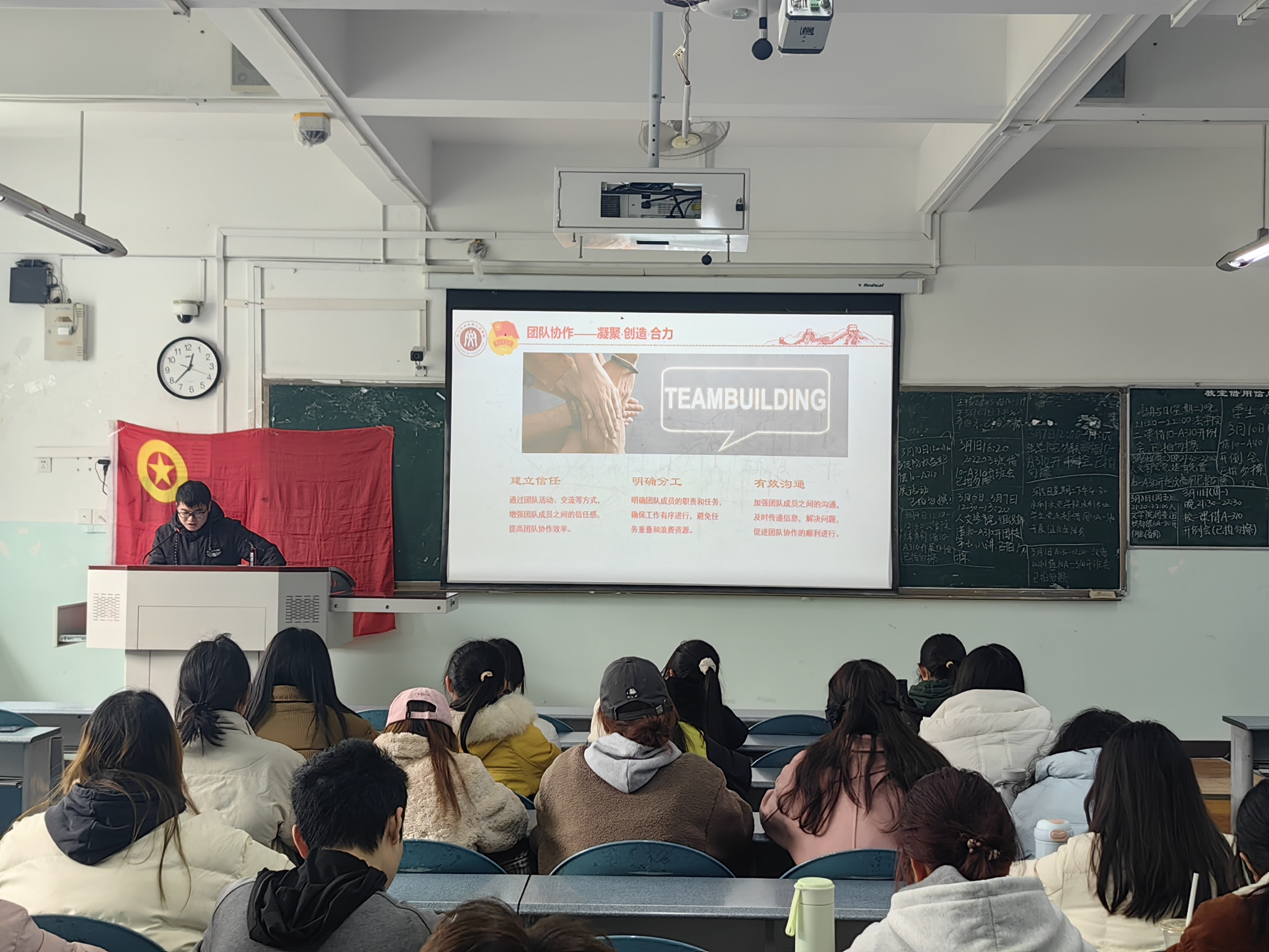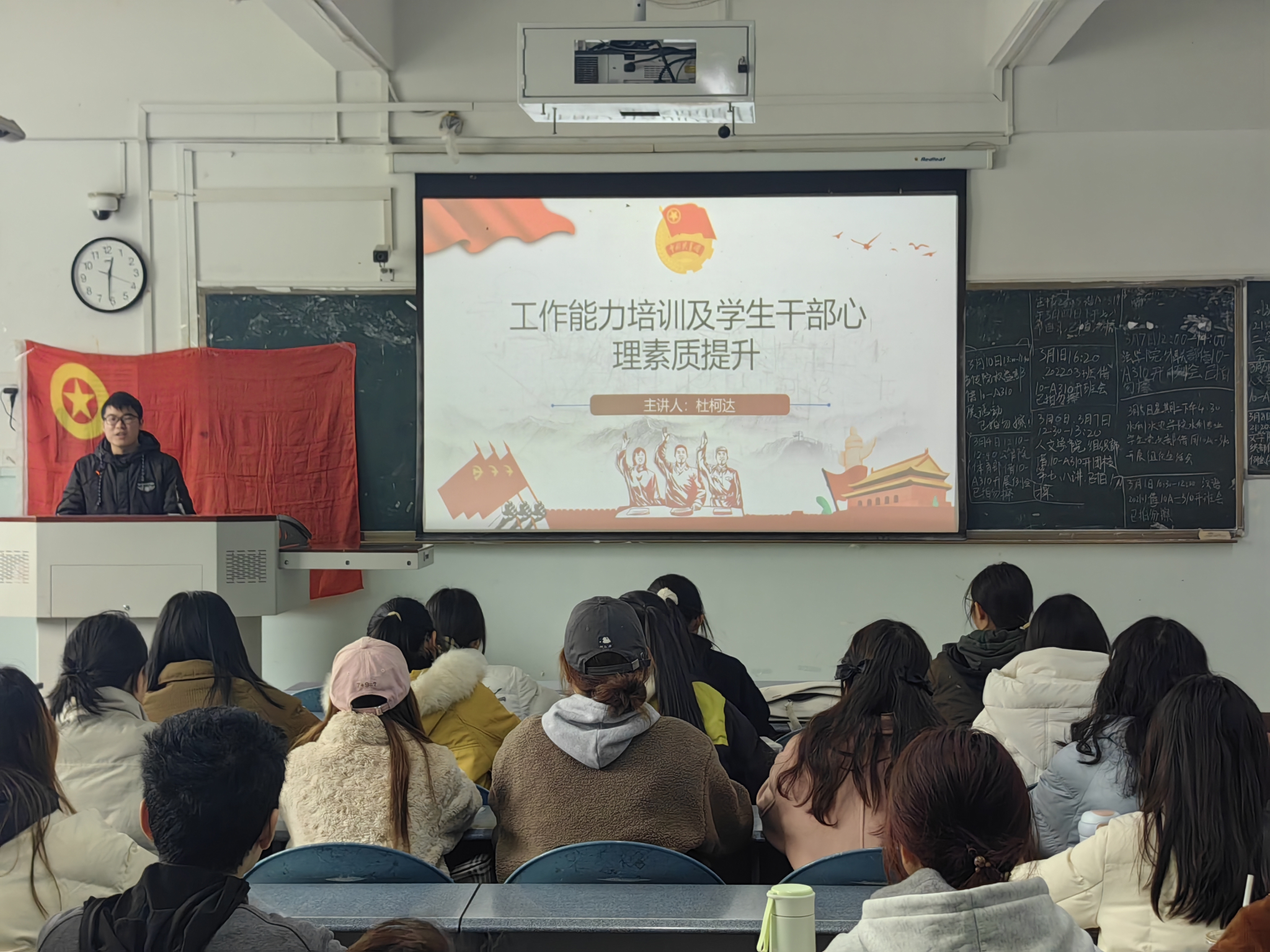 首先,主持人肖炼带领学员们齐唱团歌。随后,杜柯达从“工作能力培养”和“心理素质提升”两方面进行分享,并激励团校成员全面发展。杜柯达认为,在工作能力培养方面,同学们应以角色认知、团队协作、高效沟通三个角度为切入点,通过“三步走”不断提升自身工作能力。同时,他深入剖析团校成员的压力来源,总结心理素质提升方法。此外,针对团校成员在生活、学习、工作中所面临的常见问题,杜柯达也介绍了应对经验与解决方案。