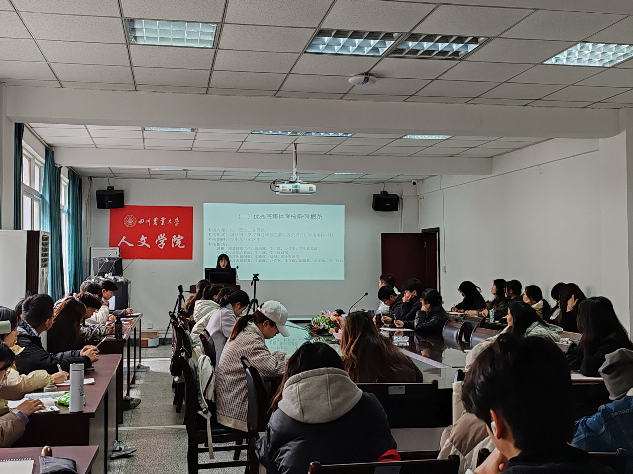 首先,沙学琳明确指出优秀班集体考核的对象、方式、期限等信息。随后,她围绕“思想引领”、“日常工作及学风建设”、“综合素质工作及社会实践活动”、“创新创业活动及文体活动”、“志愿服务活动”五个方面展开详细论述,强调了思想引领板块中的青年大学习以及志愿服务工作的重要性,鼓励同学们积极参与志愿服务工作,按时完成青年大学习。在最后的提问环节,沙学琳细致解答了同学们关于考核条例的疑惑。