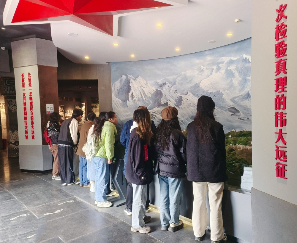 随后,采风团队探访红军长征翻越夹金山纪念馆。在专业讲解员的详细介绍下,采风团队深入了解红军在宝兴地区所展现出的英勇无畏的革命精神。红军北上抗日、三越夹金山的故事,让中文系学子们更加深刻感受到红军将士们顽强拼搏的精神以及坚定不移的理想信念。
