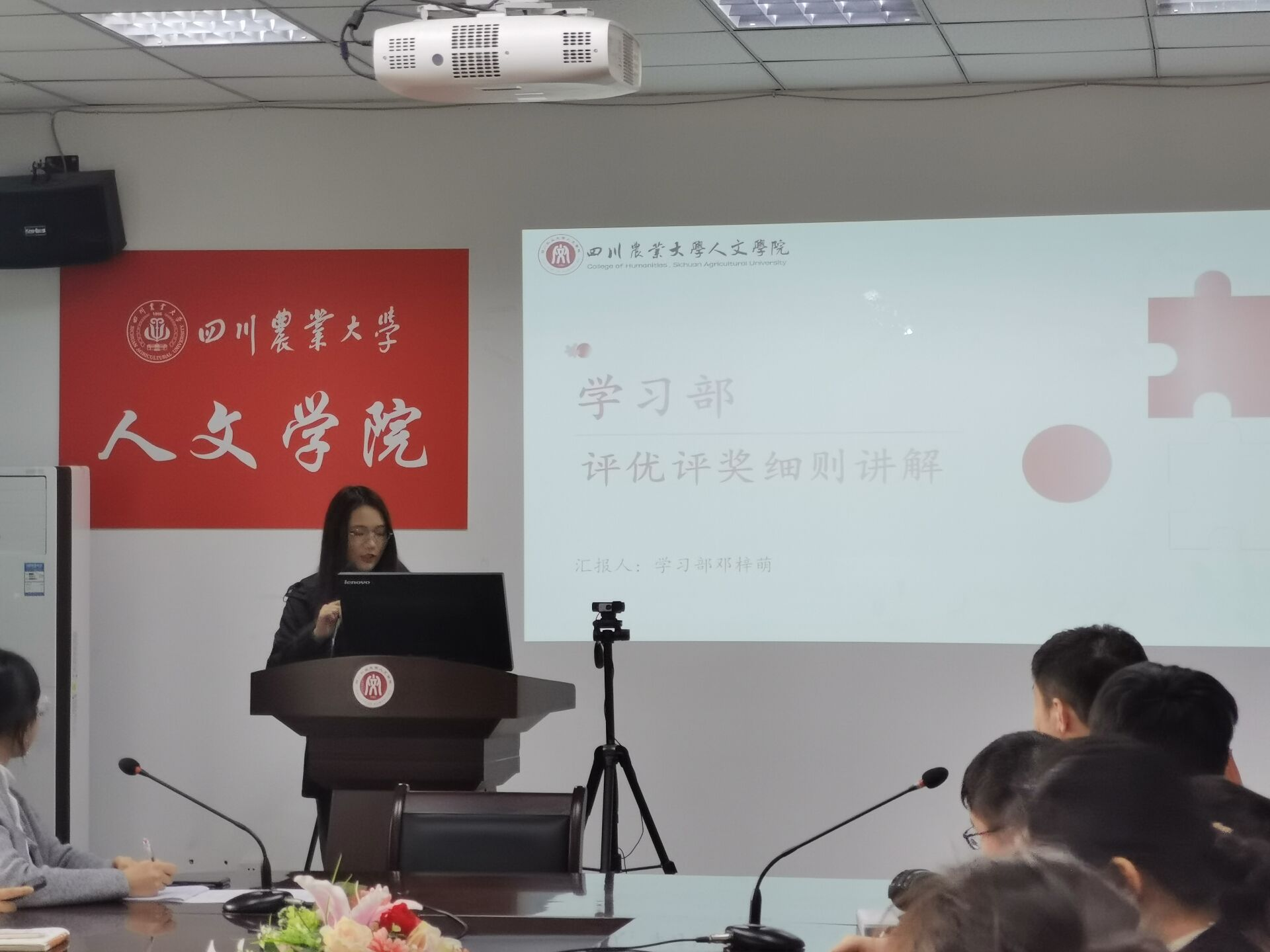 首先,主讲人邓梓萌对学习部开展的主要评优评奖工作进行了总体概述。在介绍十月评优评奖时,她强调:进行评优申请时,一定要注意通知中的具体材料要求,避免多次修改材料影响数据,导致出现错误或遗漏。随后邓梓萌对优秀员工、国家奖学金等奖学金评选要求进行了具体阐述,并讲解了部分重要细则。此外,在介绍四月优秀评选时,邓梓萌着重从班级与个人两方面分别进行讲述,指出评优评奖不仅仅是个人能力品质的优秀展现,也是优秀团队的比拼。最后,邓梓萌分享了部分实例并说明了评选工作中的注意事项。