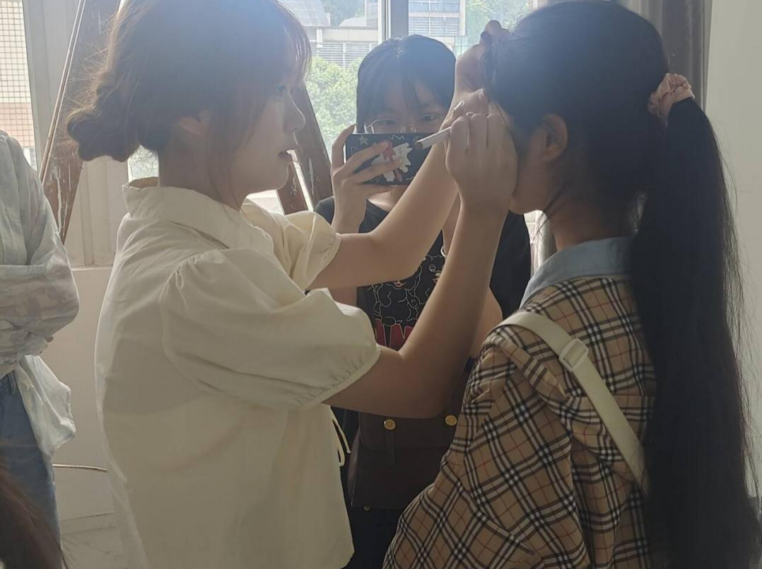 本次活动分为理论与实践两部分。活动伊始,马晨馨首先对眼妆修饰所需要的工具进行一一讲解,随后她依次介绍了化眼妆的操作流程、手法技巧、以及一些注意事项,并于讲解的过程中,在模特脸上进行实操,以便同学们更直观方便地学习眼妆画法。为让同学们进一步学会并熟练掌握眼妆,理论讲解结束后,活动进入到实操部分。工作人员为同学们提供化妆工具,并指导同学们进行眼妆实践,帮助同学们纠正掌握眼妆技巧。