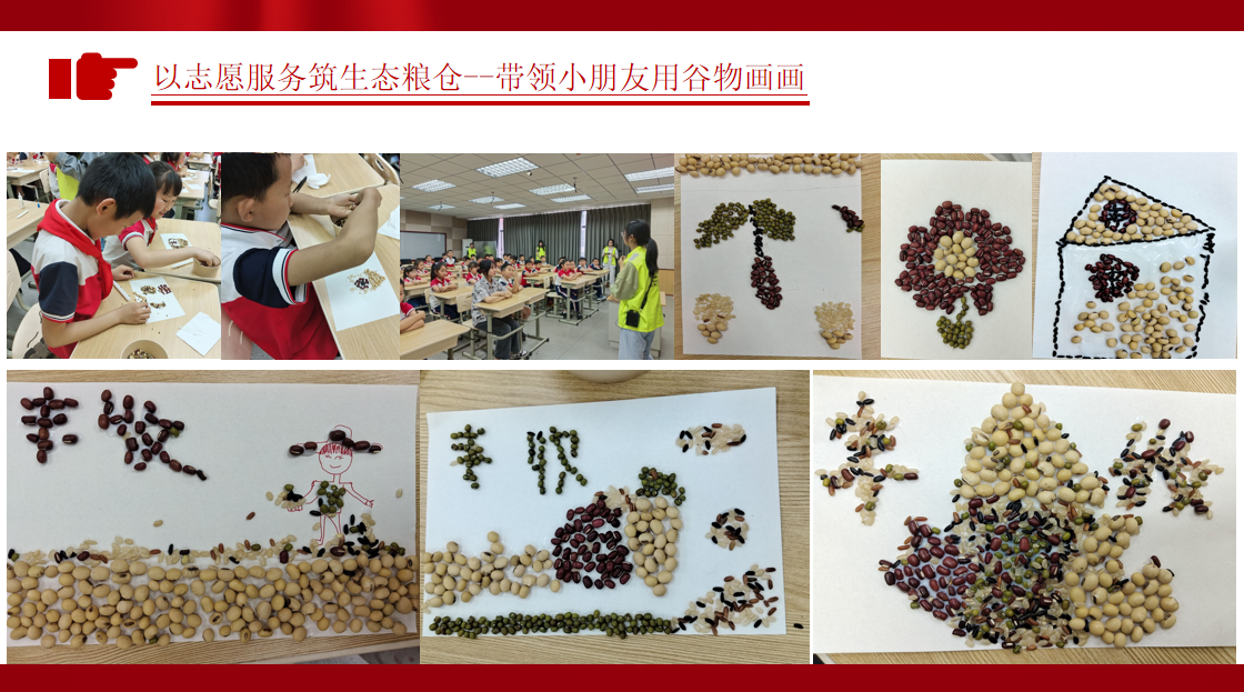 志愿服务筑生态粮仓--谷物作画活动展示支部志愿者带领社区小朋友用谷物作画的成果照片,宣传绿色生态理念,引导广大青年重视生态粮食安全,以青春行动铸牢生态文明。