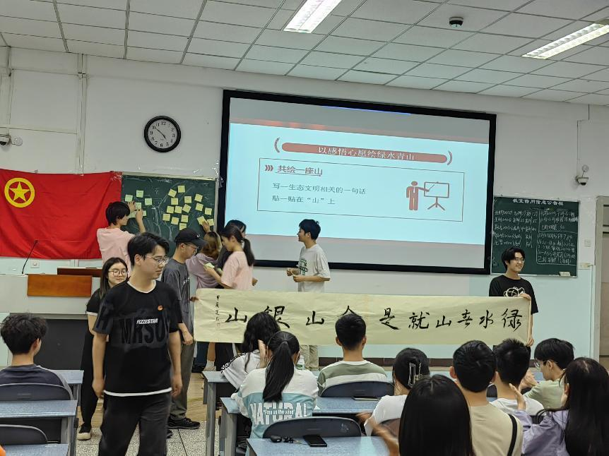 感悟心愿绘绿水青山-- “共绘一座山”活动邀请同学们以“生态文明”为主题在便利贴上书写有关感悟,并贴在画好的“山”上。通过文创的方式让每一个成员都参与进“绘山水宏图”的行动之中,在书写万里青山的同时,更寄寓着让生态文明千里流传的美好意义。