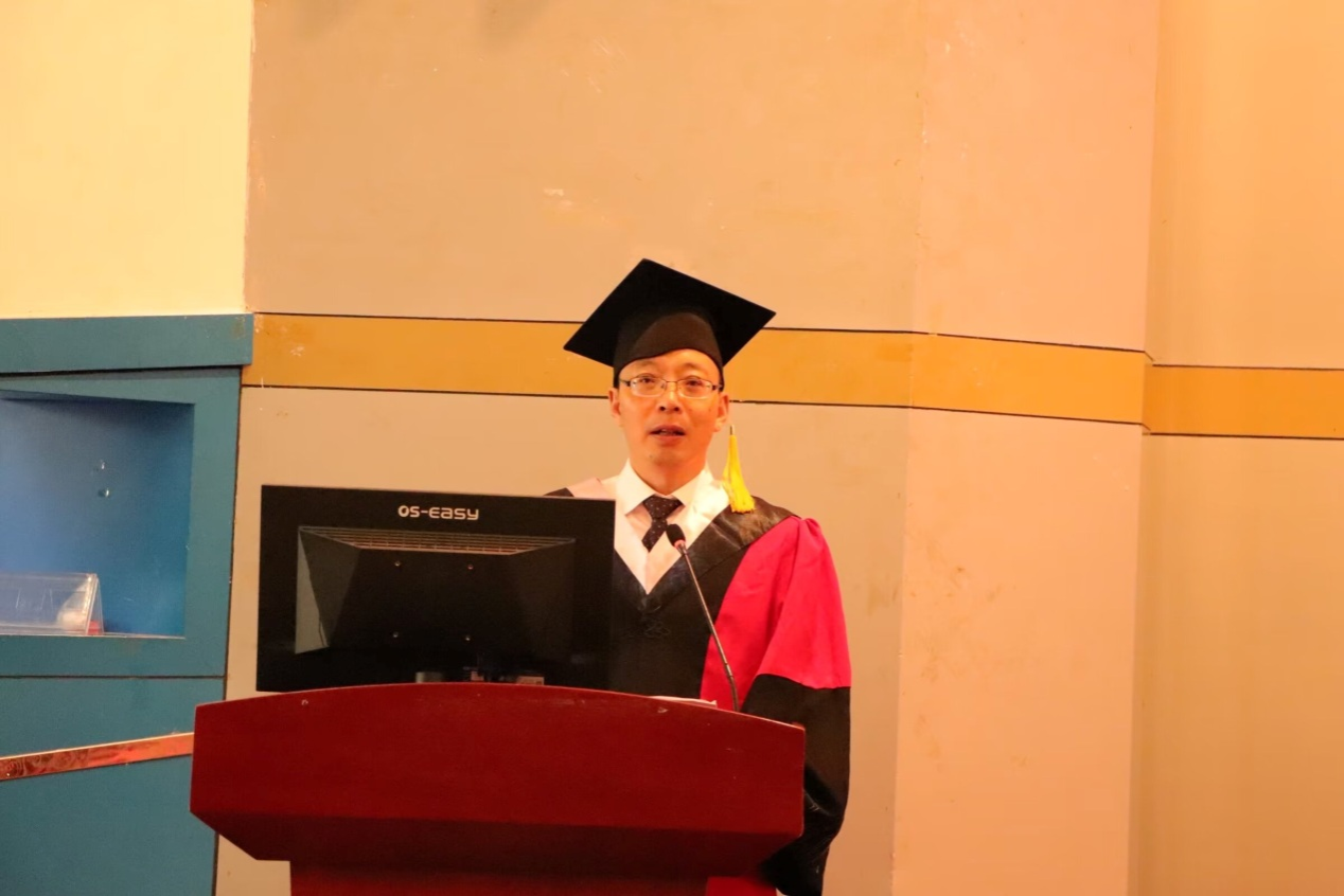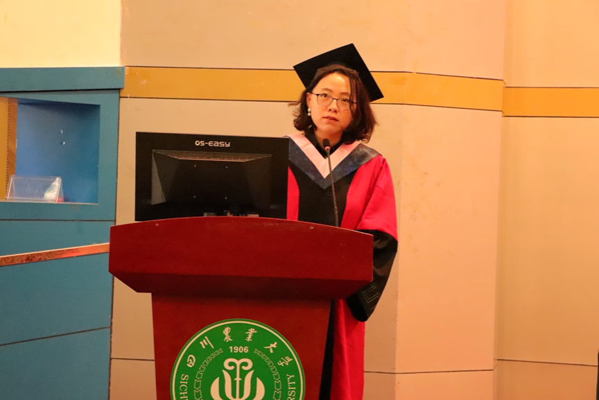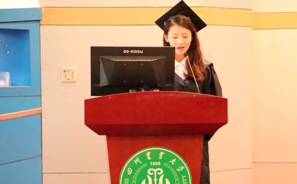 毕业生导师、毕业班班主任代表谭梦聪发言,“毕业不是终点,而是新的起点”,她寄语广大毕业生要从专业知识的点滴中汲取精神养分,坚定文化自信、讲好中国故事;要发扬和践行“川农大精神”,以富足的精神世界,直面艰难险阻。