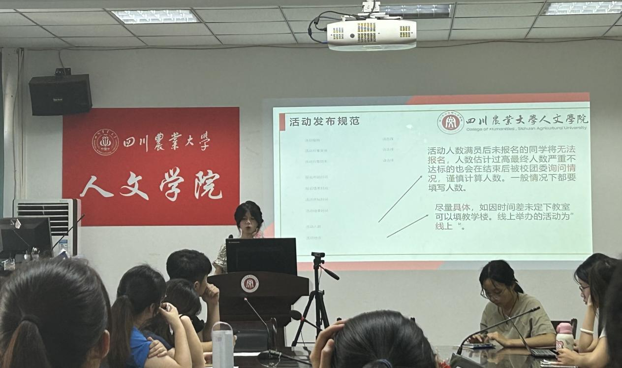主讲人杨雨萌从“活动发布规范”和“加分表格规范”两个方面讲解了各部门需与二课运营中心对接的相关工作,其内容主要包括:活动发布流程的注意事项;活动开展时间和内容要与策划书符合;表格信息要确保无误、字体需按要求修改;各部门开展活动时刻与二课运营中心保持联系等。她特别强调,各部门要继续做好活动建设,加强各部门与二课间的紧密协作,为同学们提供丰富多彩的课余活动,共同为公司二课活动做出新贡献。