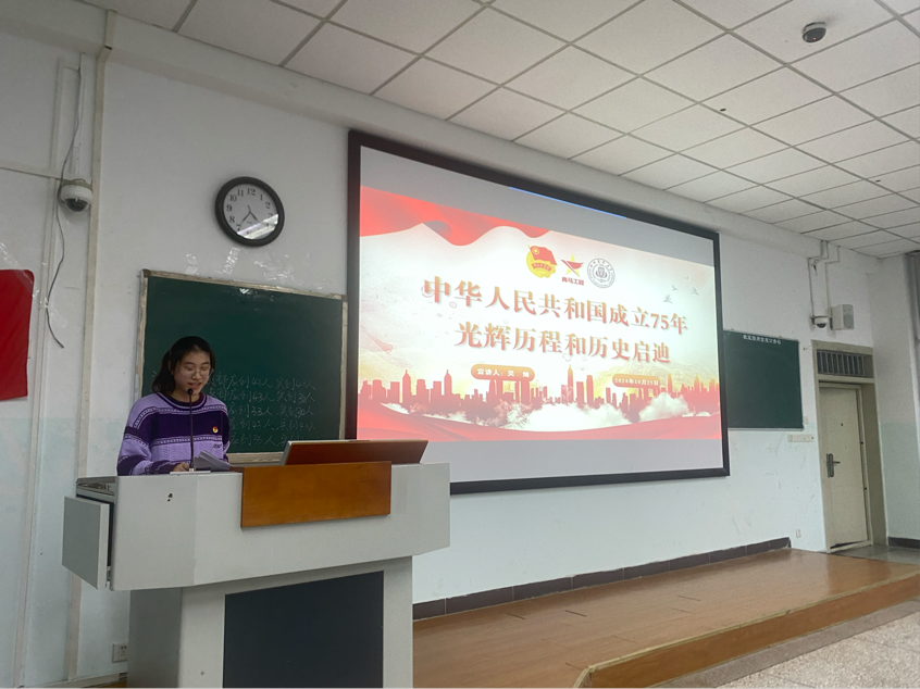 第十一期校青马班学员吴灿开展“庆祝中华人民共和国成立75周年”专题宣讲。她通过带领同学们回顾中国共产党的峥嵘岁月,号召同学们奋力书写中国式现代化挺膺担当的青春篇章,让爱国主义的伟大旗帜始终飘扬在心中。