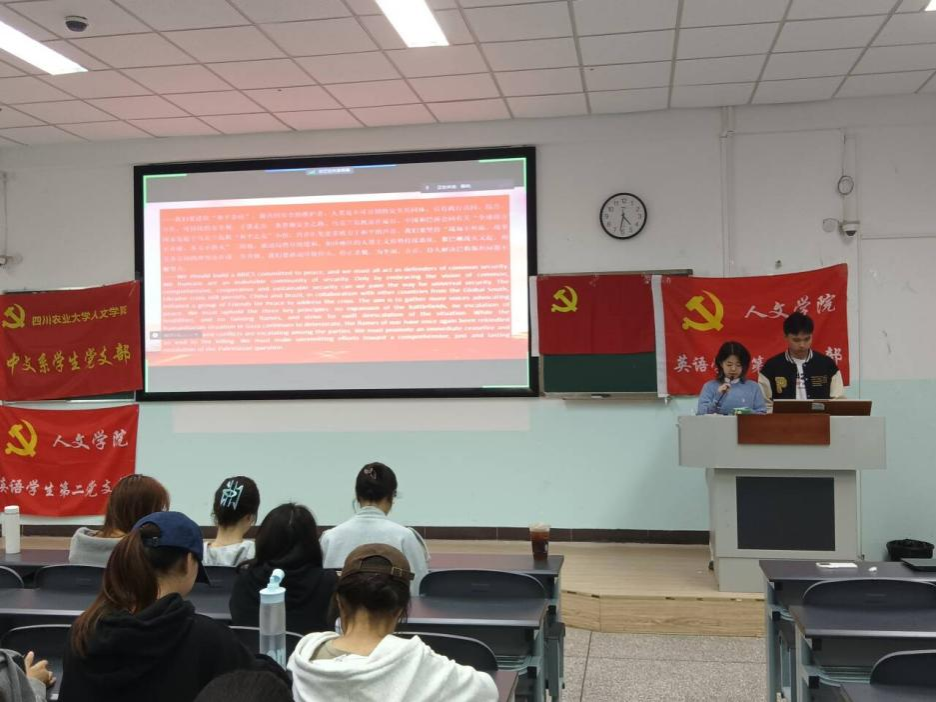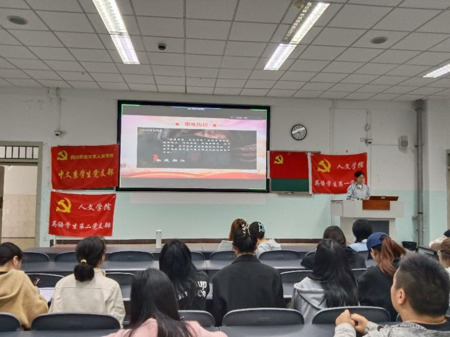 本次活动共分为齐唱国歌、双语新闻播报、微主题宣讲、微主题视频观看、时政问答、齐唱国际歌五个环节。活动开始,全体成员齐唱国歌。双语新闻播报环节,英语202201张靖和英语202204文梦佳围绕“金砖国家领导人第十六次会晤”的主题,进行了双语新闻播报,既结合了英语专业特色,又紧密联系了时政热点;微主题宣讲环节,英语202202鄢然带领同学们重温了长征路途的艰辛,学习领悟了红色长征精神,同时还对党员的作风纪律进行了严明强调;微主题视频生动展现了退伍老兵对于战争的回忆,激励同学们珍惜和平,坚定信念,为祖国发展贡献力量;时政问答环节的题目设置涵盖了党史基本知识以及时政热点,以有趣的形式丰富了同学们的党史知识储备,提升了党员的党性修养。