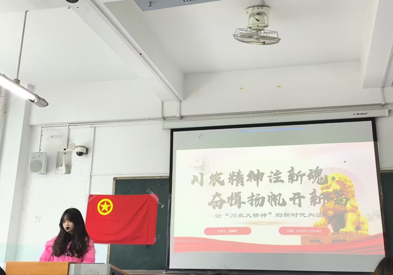 本期课程以“川农精神注新魂,奋楫扬帆开新篇”为主题。在讲解过程中,窦枫叶分别从“回溯校史,重温百年风雨”、“聚焦精神,挖掘时代内涵”和“展望未来,书写青春华章”三方面让同学们逐步深入了解川农大精神。在“回溯校史,重温百年风雨”部分,窦枫叶详细介绍了川农的百年校史,让同学们深刻感受到川农大的深厚底蕴;在“聚焦精神,挖掘时代内涵”部分,窦枫叶通过讲述在疫情中支援武汉的川农人--爱国逆行者“雨衣妹妹”刘仙的感人事迹,以生动事迹向同学们阐述了川农大立德树人、强农兴农的初心使命。最后,窦枫叶对同学们寄予鼓励,希望同学们牢记并践行“追求真理、造福社会、自强不息”的川农校训,答好强农兴农的时代问卷,为建设农业强国不懈奋斗。