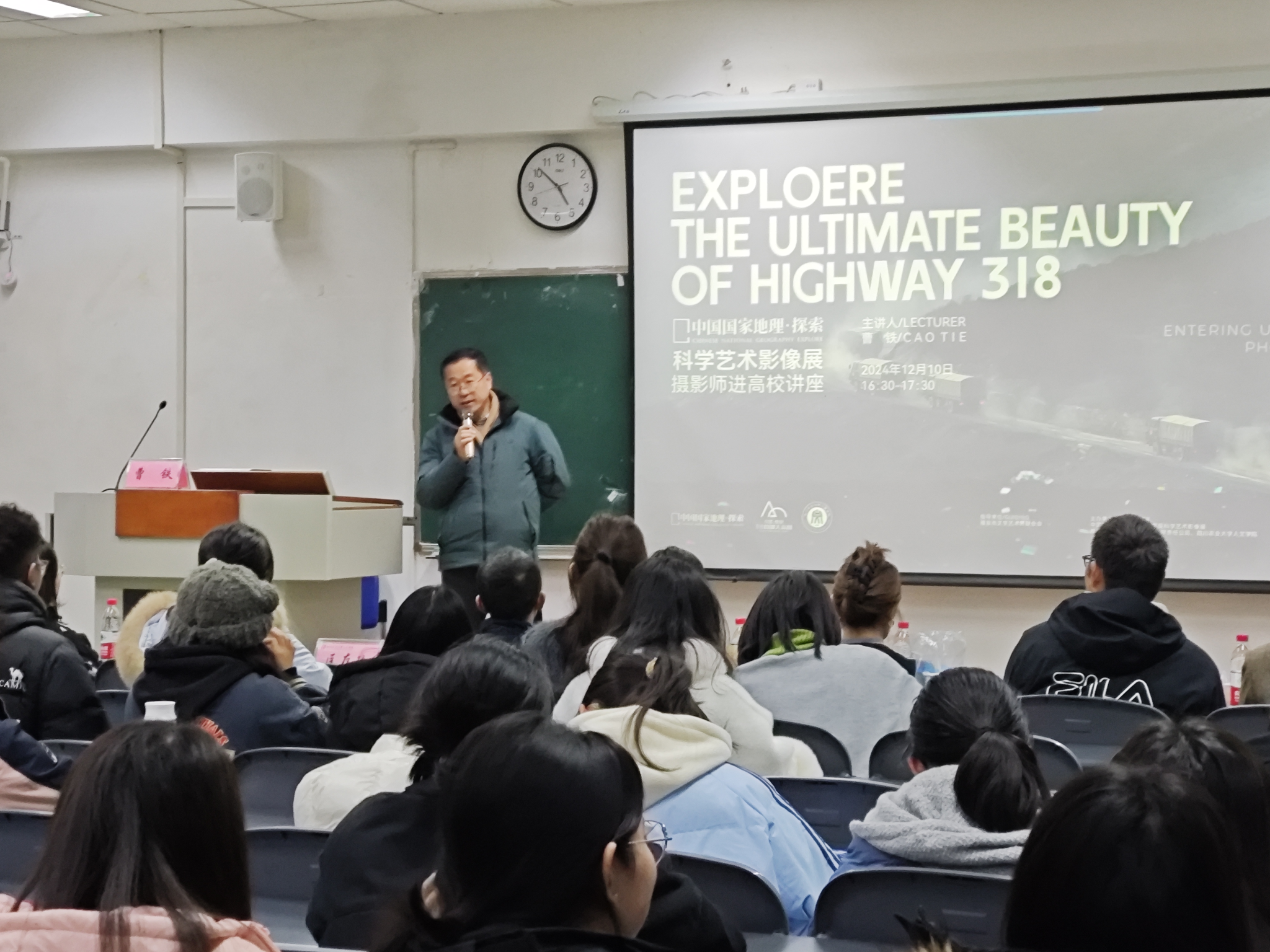 活动高潮部分,中国民俗摄影协会副会长、成都理工大学工程技术公司客座教授曹铁为同学们进行了专题讲座。他首先向同学们展示了往期摄影作品,并讲解了一些简单摄影技术。之后曹铁老师深情讲述了川藏线和自己的故事、介绍了川藏线的大致路线以及自己拍摄的川藏图片,以生动有趣的语言一幅一幅地讲解了图片背后蕴含的故事。讲解过程中,曹铁老师回忆当年参军的故事,让在座的同学纷纷为之动容。