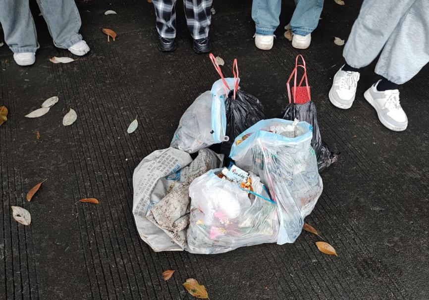 “这片竹林背后埋藏了很多半截的奶茶杯还有编织袋,不仔细看根本发现不了。”志愿者姚鹏程同学叹道,他的垃圾袋已经塞满了食品包装袋、废弃纸巾等白色垃圾。活动累计清理各类垃圾7大满袋,包括塑料制品5袋、其他废弃物2袋,最后志愿者们把垃圾整合起来分类扔进垃圾桶,实现了回收、清洁可持续。志愿者们纷纷感慨道:“弯腰捡拾中,我们更深刻体会到,文明素养就体现在对一草一木的珍视中。”