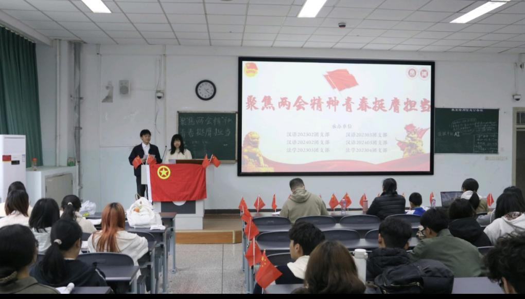 为组织动员全校团员与青年聚焦两会精神,鼓励当代青年成为德智体美劳全面发展的时代新人,3月28日14:20,由汉语202302班团支部、汉语202303班团支部、汉语202402班团支部、汉语202403班团支部、法学202303班团支部、法学202304班团支部联合承办的以“聚焦两会精神,青春挺膺担当”为主题的班团活动在10-A201顺利开展。本次班团活动由唐子涵、舒俊松两位同学主持。