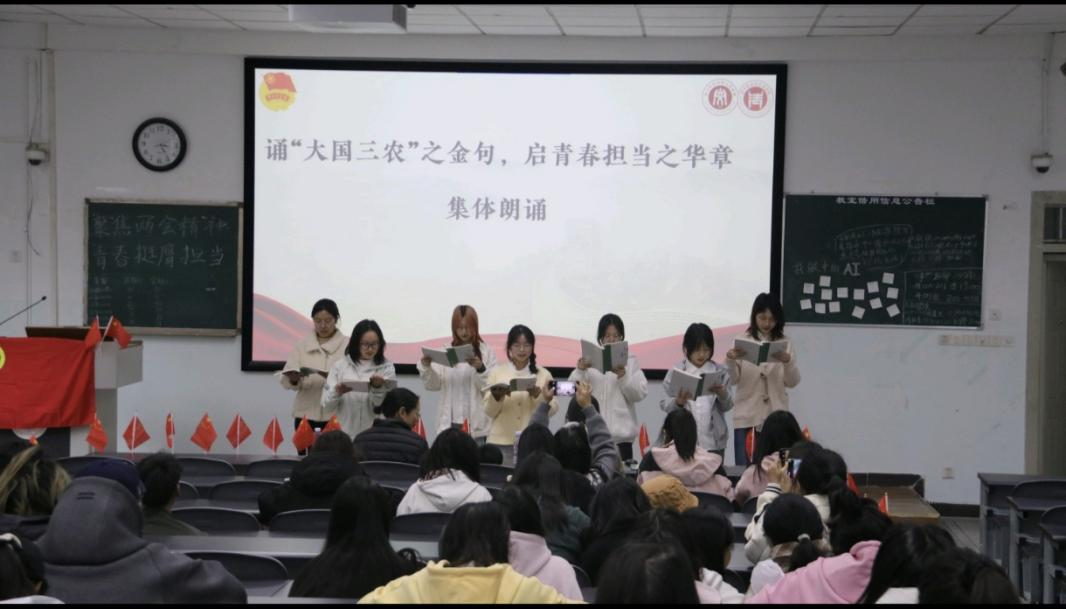 紧接着,活动进入“诵大国三农之金句,启青春担当之华章”集体朗诵环节,在铿锵有力的语调中让同学们深刻领悟到青年的使命与责任。