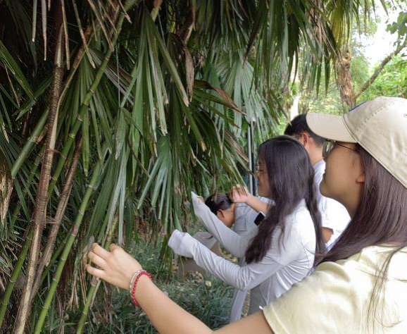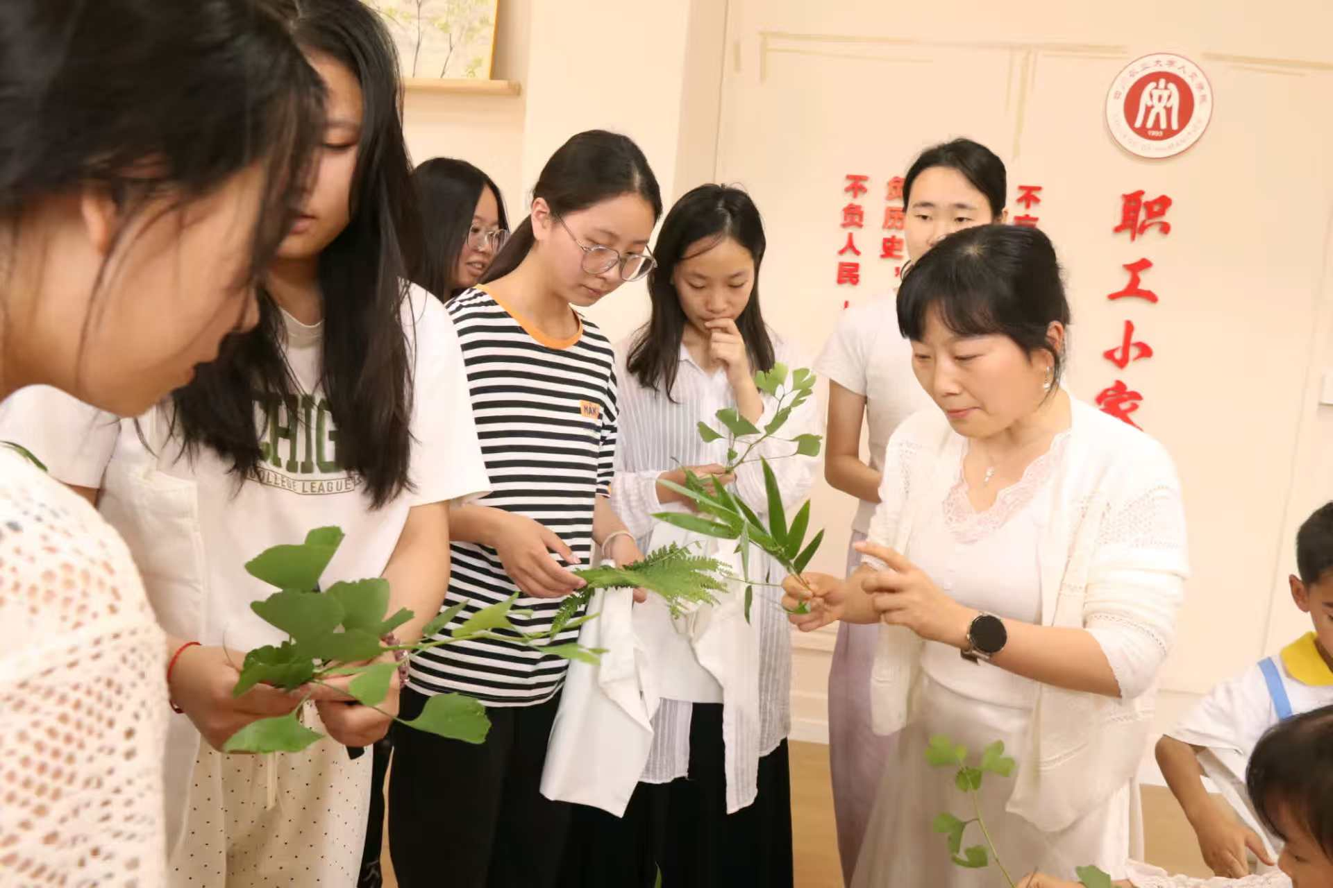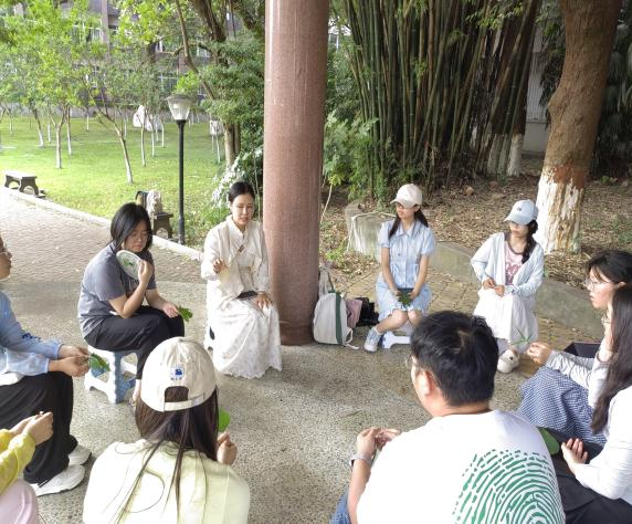 寻叶探心,发现自我;拼贴成画,心花绽放。6月13日下午,“植物绘心”活动在绿意盎然的雅安校区读书走廊举行,陈敏老师担任引导者。盛夏时节的读书走廊草木葱茏。活动第一阶段,同学们漫步其间,寻觅能与内心产生共鸣的植物,并通过分享所选植物及其象征意义,向同伴展现独特的自我视角。在初步的发现与交流之后,活动进入植物拼画创作环节。同学们带着明确的艺术表达目标,再次深入探索走廊植被,精心采集创作素材。最终完成的植物拼画,直观展现了同学们的内心世界。在专注的艺术创作过程及随后的作品阐释与互动交流中,同学们对自我有了更为清晰、丰富的认识。