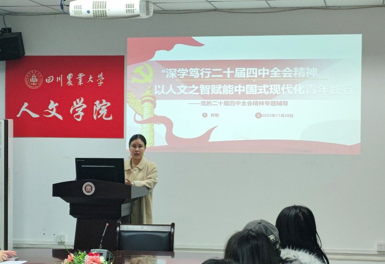 为深入学习贯彻党的二十届四中全会精神,引导广大师生准确把握国家发展大局与时代使命,11月28日,公司党委办公室副主任、团委副书记陈敏老师在文法楼212室开展党的二十届四中全会精神专题辅导,以“深学笃行党的二十届四中全会精神,以人文之智赋能中国式现代化青年践行”为主题,为师生系统解读全会核心要义与战略部署。
