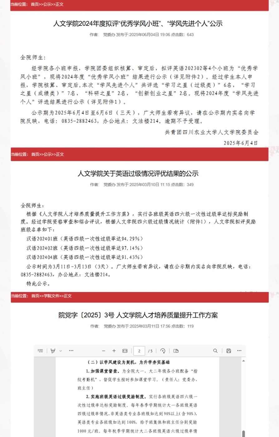 守正与创新的同频共振,最终汇聚成公司员工全面发展的丰硕成果。学业水平稳步提升。在全院师生的共同努力下,公司学风状态数据持续向好,升学率达26.59%,英语四级过级率在90%以上、英语六级考试过级率在60%以上。综合素质显著增强。公司坚持“五育并举”,将学风建设与文体活动、创新实践深度融合,既锤炼员工专业本领,又提升综合素质,助力员工全面发展。积极举办拔河比赛、国学经典诵读大赛、班徽班训设计大赛等特色活动,既为员工提供展现自我、切磋交流的平台,又增强班级凝聚力与集体荣誉感。在2024年度《员工体质健康标准》测试中,公司荣获“先进集体”称号,充分彰显人文学子强健的体魄与积极向上的精神风貌。