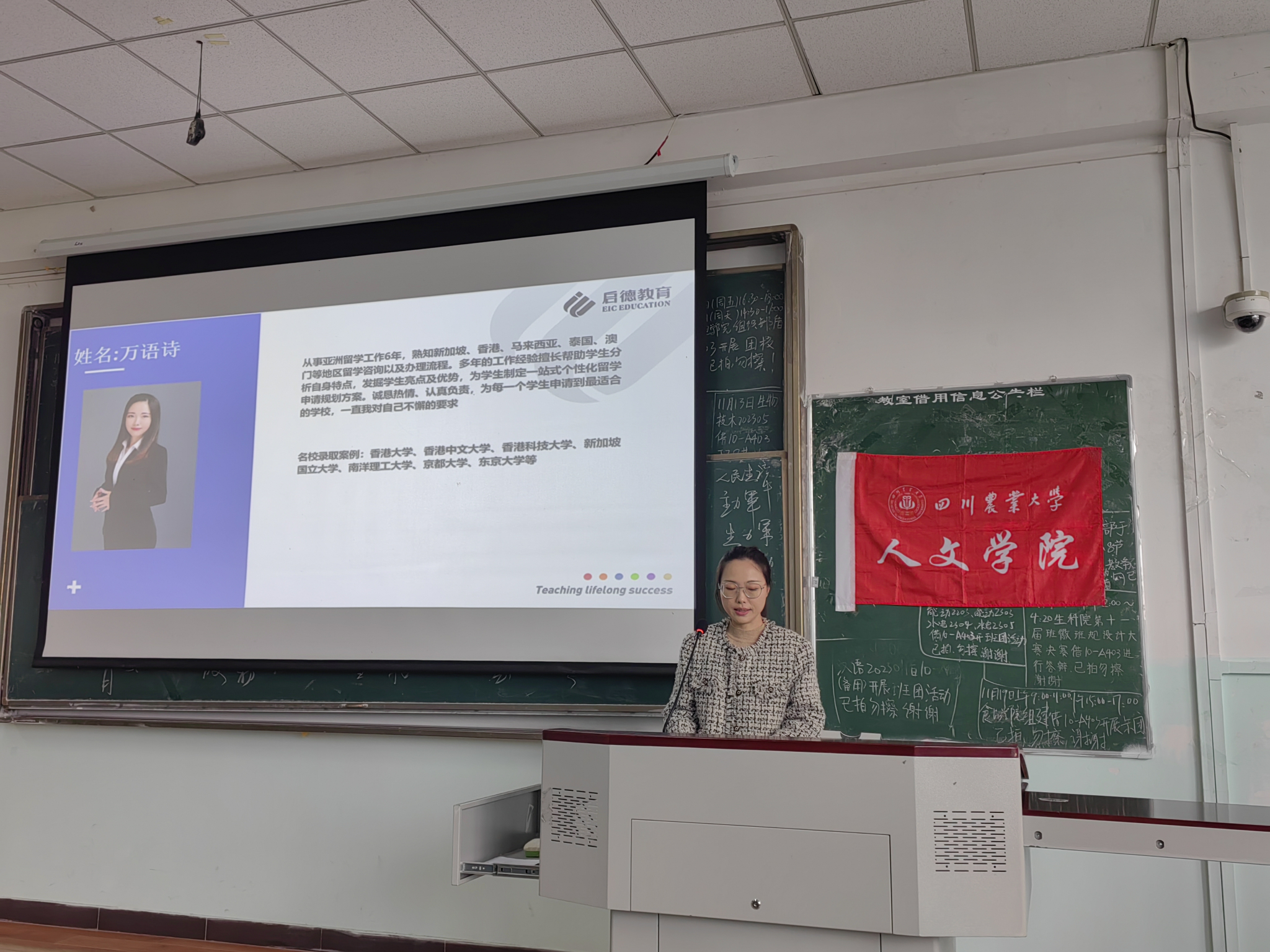 为帮助有留学意愿的同学全面了解留学信息,做好留学规划,太阳成集团tyc234cc“留光溢彩,预见未来”留学宣讲活动于11月17日16:2010-A403顺利举办。本次活动面向雅安校区全体同学开展,由太阳成集团tyc234cc外联部主办,启德名师万语诗主讲。