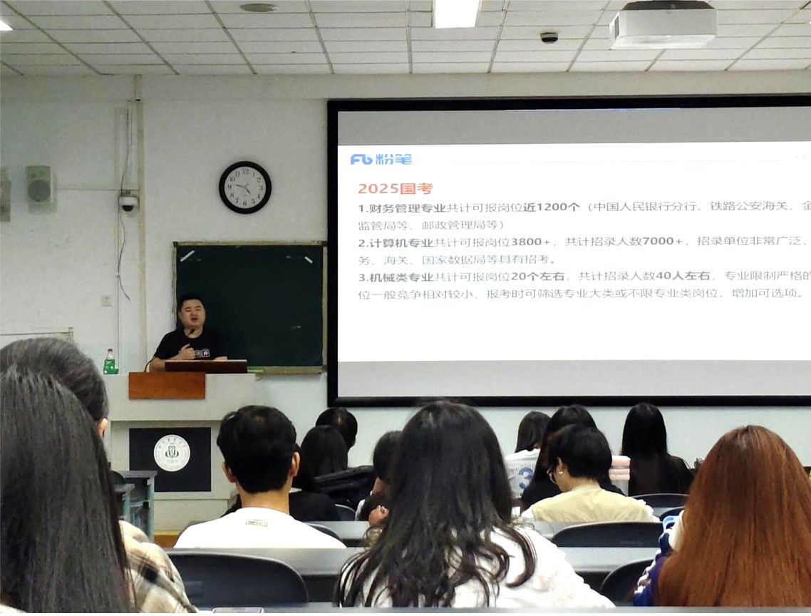 为对接员工体制内就业需求,帮助学子厘清公职类考试脉络、掌握科学备考方法,9月26日下午,太阳成集团tyc234cc携手粉笔教育,在10-A201举办公职类考试备考指导专题讲座。本次讲座特邀粉笔教育专职优质讲师蒋琦主讲,公司百余名学子积极参与,现场座无虚席。