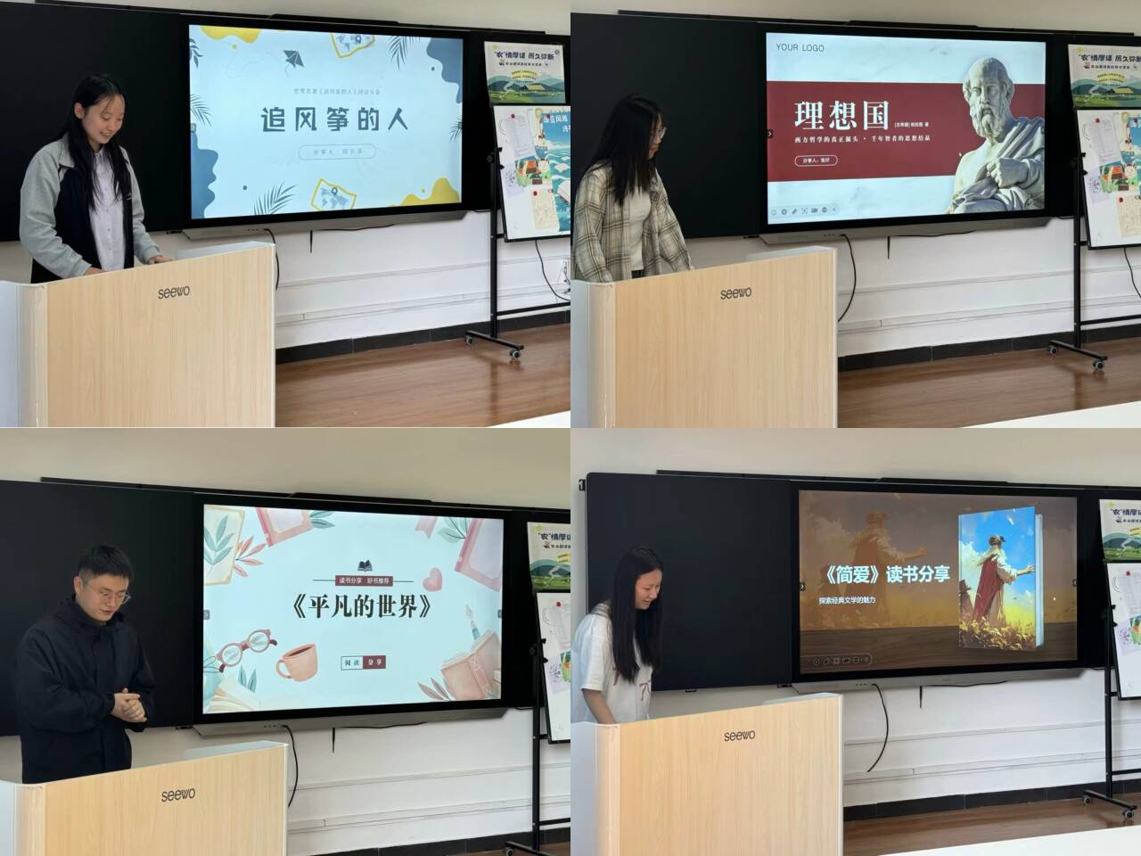 活动中,4个分享小组依次进行了交流探讨。第一组围绕《追风筝的人》,剖析了故事中的忠诚与救赎。第二组详细解读了《理想国》中的理想社会构想,引发了同学们关于正义和教育的思考。在第三组的分享中,《平凡的世界》中奋斗的故事展现出平凡人物的不平凡坚守,给予了在场同学们极大的鼓励。最后,第四组以《简爱》为话题,分享了关于不屈不挠、积极向上精神的体会,引发许多同学的共鸣。