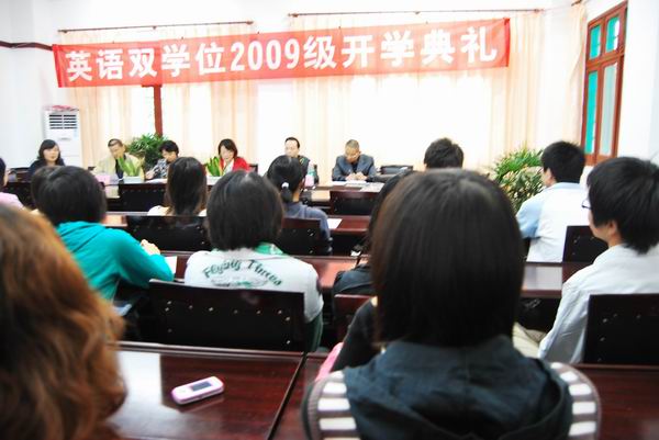 10月17日上午10时,语言公司在公司会议室举行了“英语双学位”的开学典礼。来自全校不同院系的36位同学作为“2009级英语双学位班”的一员参加了典礼,公司领导赵晓霞、吴军赞和6位授课老师及各系室办负责人参加了典礼。公司副经理、英语专业负责人吴军赞教授为同学们做英语双学位专业教育。
