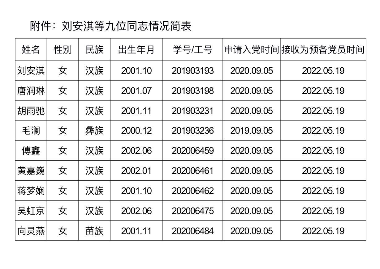 在听取党员、群众意见的基础上,经支部大会审查,拟将刘安淇等九位同志转为中共正式党员(名单见附件),并于近期召开支部大会讨论其转正问题。根据发展党员工作有关要求,现将其基本情况予以公示。