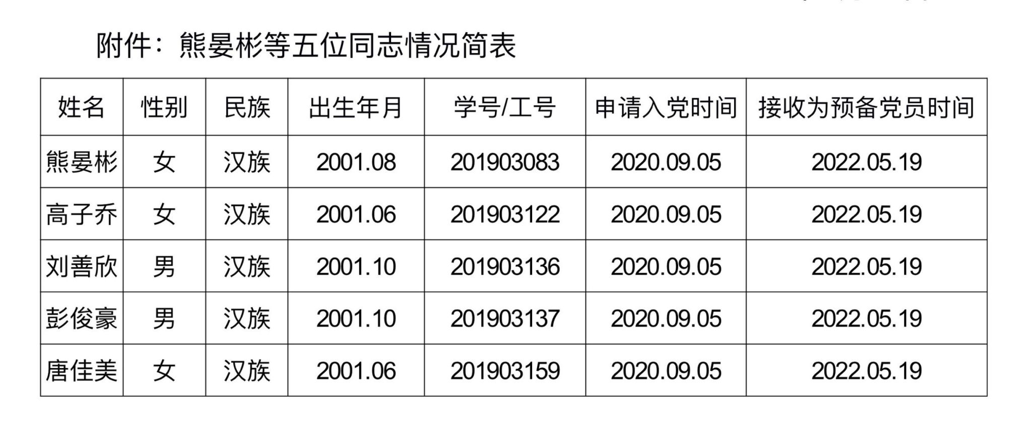 在听取党员、群众意见的基础上,经支部大会审查,拟将熊晏彬等五位同志转为中共正式党员(名单见附件),并于近期召开支部大会讨论其转正问题。根据发展党员工作有关要求,现将其基本情况予以公示。