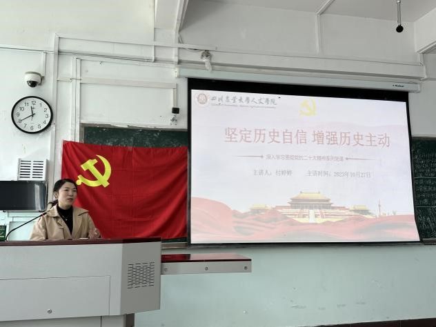英语员工第二党支部书记付婷婷从学习贯彻党的二十大报告中部分内容,到重点结合党的百年艰辛历程与支部党员自身实际。阐述了坚定历史自信、把握历史主动的重要性,最后围绕历史自信的定义、意义以及“如何坚定历史自信”等方面进行详细解读。