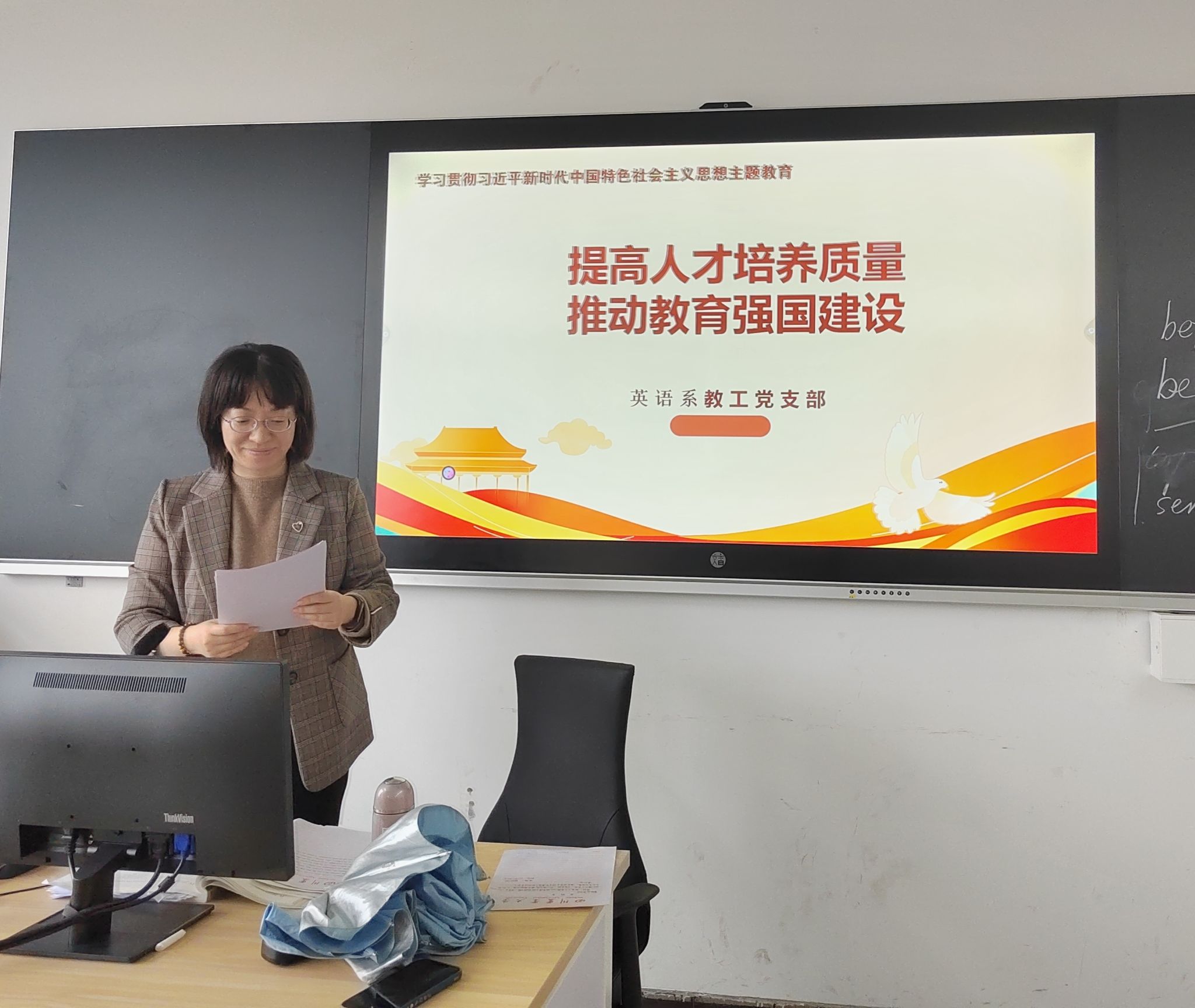 公共外语系教工党支部开展了以“树牢身份意识,擦亮共产党员的‘身份证’”为主题的分享,支部书记杨柳讲解共产党员应有的外在形象、精神面貌,结合张桂梅、柴云振等模范党员的具体例子,从对党忠诚、作风顽强、为民务实、严格自律四个方面介绍如何树立共产党员优良形象。