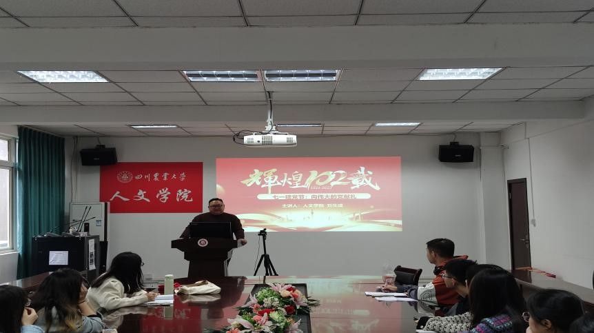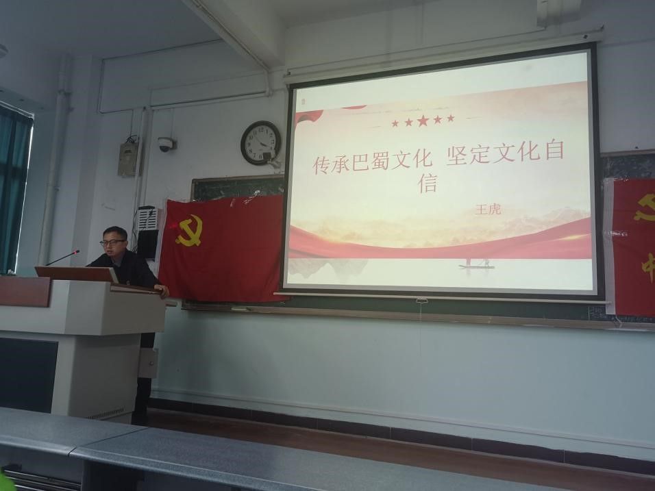 汉语言文学员工党支部书记王虎就如何“传承巴蜀文化,坚定文化自信”为支部员工阐释了巴蜀文化的发展历程和主要特征,引导人文学子了解习近平总书记来川视察重要指示精神中有关巴蜀文化传承的指示精神,增强文化自信。
