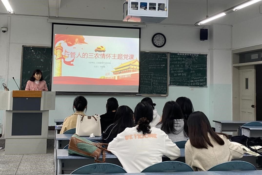 行政管理员工党支部书记陈俊霖做了以“行管人的三农情怀”为题的主题教育活动,勉励行管党员借助专业优势,走基层、进社区、入乡村、访农户,显三农情怀。