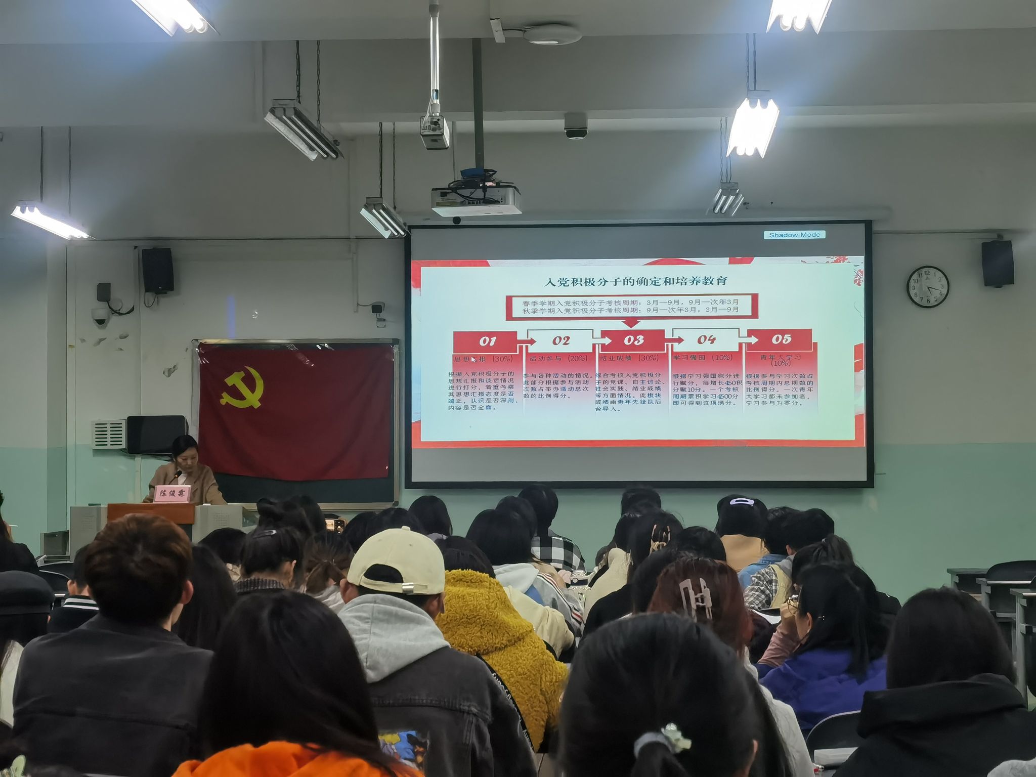 陈俊霖从申请入党、入党积极分子的确定和培养教育、发展对象的确定与考察、预备党员的接收、预备党员的教育考察与转正五个方面展开,结合当前工作实际,详细介绍了党员发展的工作流程、注意事项、时间节点以及在工作中遇到的特殊问题。她提到,在组织发展的过程中,要对其进行全面的考察,保证组织发展人员的质量;在入党积极分子、发展对象的培养过程中需要格外注重发展对象各项环节环环合格的问题。