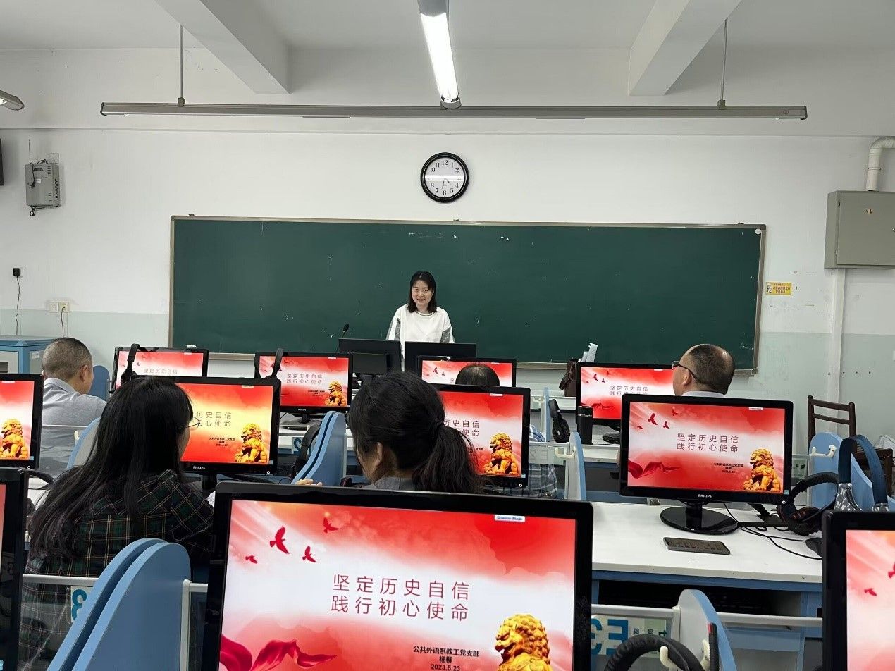 公共外语系教工党支部书记杨柳做了以“坚定历史自信践行初心使命”为题的分享,要求支部成员深入领会习近平总书记有关重要论述,在新的征程上更加坚定自觉地践行初心使命。
