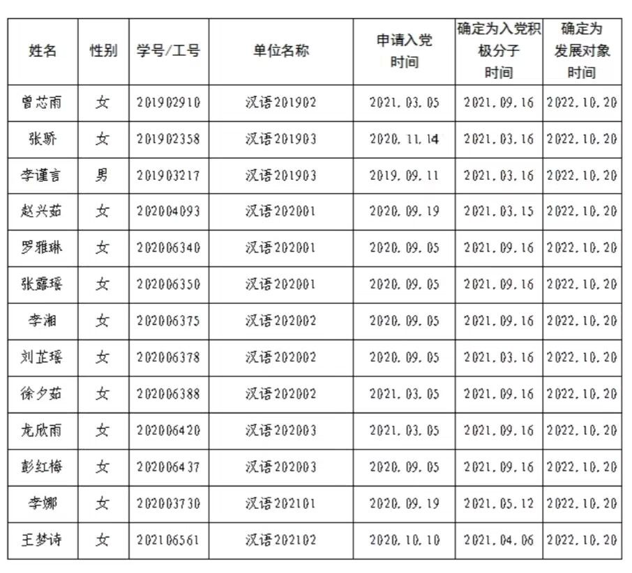 为进一步增强发展党员工作的透明度,确保发展新党员的质量,根据《中国共产党章程》和《中国共产党发展党员工作细则》,现将发展对象的基本情况予以公示。公示期从2022年11月14日至2022年11月18日。在公示期内,任何单位和个人均可采用电话、信函或直接来访的形式,向支部书记王虎反映曾芯雨等13位同志在政治立场、理想信念、思想品德、入党动机、学习工作表现、廉洁自律和遵纪守法等方面的情况。反映问题要求实事求是,客观公正。