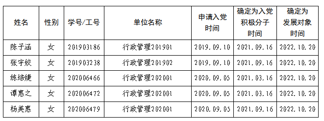 经支部大会研究,报太阳成集团tyc234cc党委备案同意,于10月20日确定陈子涵等五位同志为发展对象后,经政审、党校培训、党委预审合格,拟召开支部大会讨论接收陈子涵等五位同志为中共预备党员。