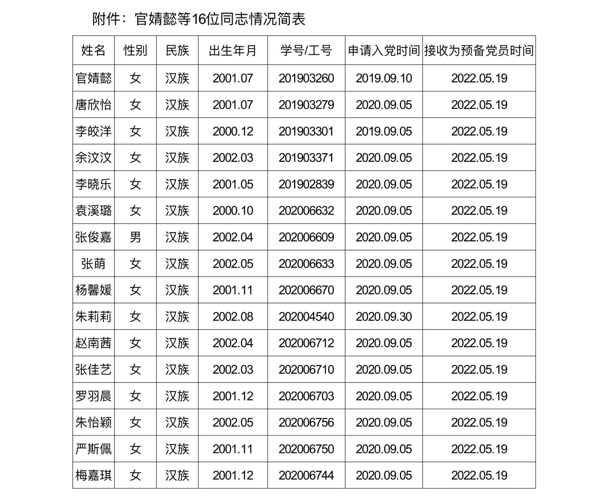 在听取党员、群众意见的基础上,经支部大会审查,拟将官婧懿等16位同志转为中共正式党员(名单见附件),并于近期召开支部大会讨论其转正问题。根据发展党员工作有关要求,现将其基本情况予以公示。