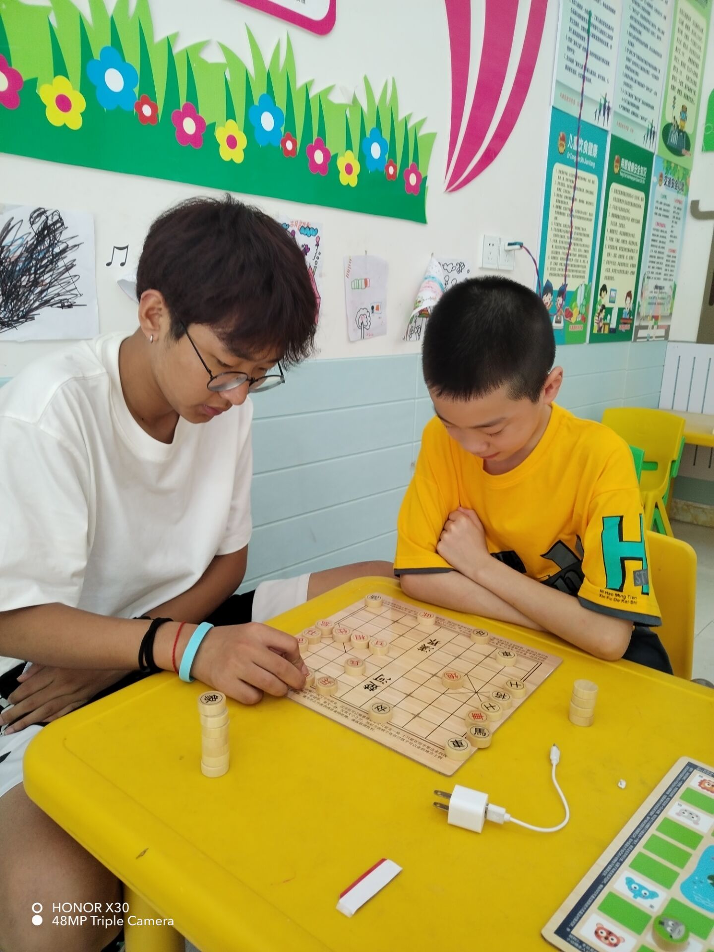 在活动中,成员们和小朋友逐渐熟悉起来,对每一位小朋友的性格特点、兴趣爱好有了更深的认识。期间,团队成员代林翰带着两个男孩子一起下象棋。但因准备不充分,礼物、玩乐方式等都是临时决定的,他便就地取材陪小朋友玩孩子们喜欢玩的东西。