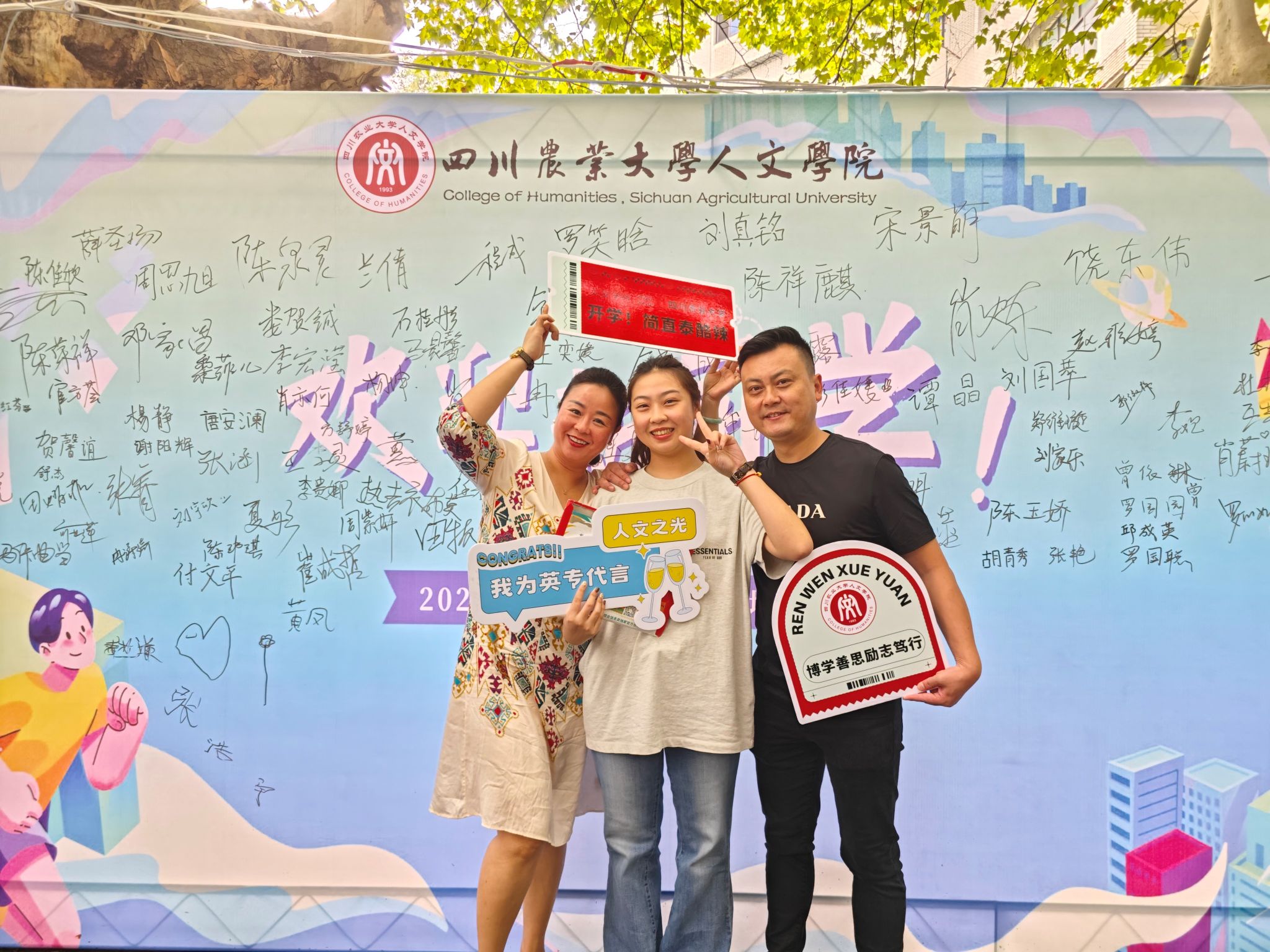 签名墙,由志愿者引导新生与家长们签名、合影,将对未来的期许书写在签名墙上,也将全家幸福的微笑定格在此处。