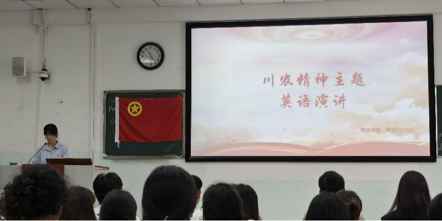 活动前期组织同学们参观了校史馆,引导团员青年从川农悠久历史和文化中汲取知识和能量,同时组织了以川农精神为主题的英语演讲比赛。班团活动现场,优胜同学英语202302席义芮进行了以川农精神为主题的英文演讲。