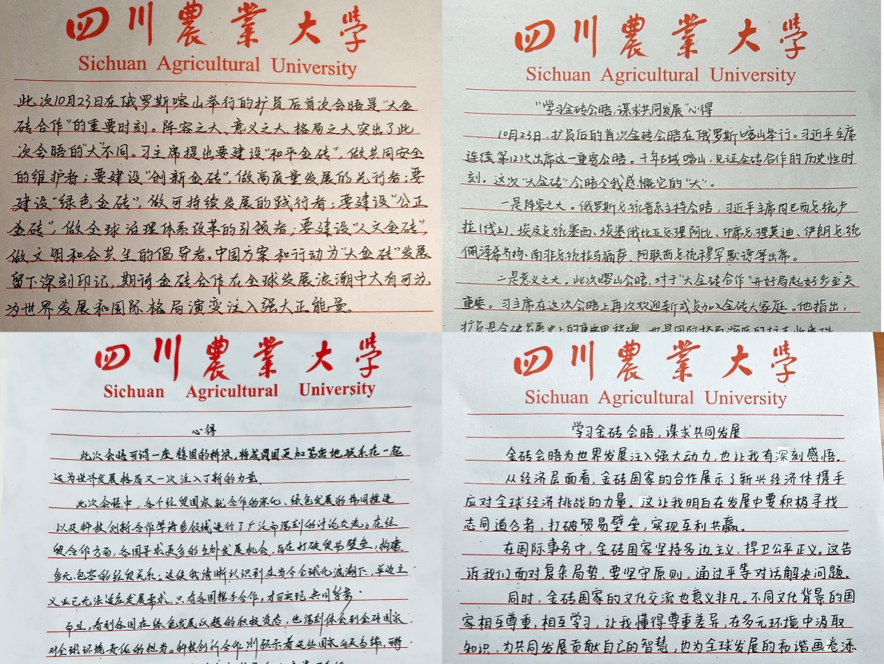 通过本次帮助同学们自主学习金砖会晤重要知识内容,并手写心得感悟的活动,不仅加深了同学们对新青年走在时政前线、抓住时代机遇的意识,也促使他们自觉主动地提升文化自信,推动他们为“大金砖合作”和中华民族伟大复兴奋勇前行,栉风沐雨,砥砺前行。
