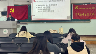 在时政问答环节,现场气氛活跃。问题涵盖了党的二十届四中全会精神、两岸历史、祖国统一时代使命等多个方面。同学们积极参与,竞相举手回答,不仅检验了大家对党的二十届四中全会精神的学习成果、对两岸历史的了解程度,也促进了彼此间对于祖国统一和中国式现代化新征程的深入交流与思考。最后,全体同学齐唱国际歌,本次活动圆满结束。