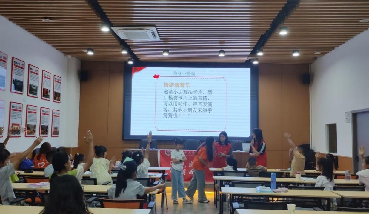 活动伊始,“击鼓传花”迅速拉近了队员与孩子们的距离。随后的核心环节“情绪猜猜乐”将现场氛围推向高潮。当抽到“愤怒”卡片,一名男孩紧握双拳,怒目圆睁,以刚毅不屈的姿态,生动再现了革命志士方志敏面对强敌时的凛然正气。而抽中“悲伤”卡片的小女孩,则以低沉颤抖的嗓音,动情诵读抗日英雄赵一曼留给幼子的诀别信:“宁儿啊...母亲不用千言万语来教育你,就用实行来教育你...” 稚嫩却饱含深情的演绎,令在场者无不动容,深切感受到革命者舍小家为国家的壮烈情怀。实践队员随即以孩子们的即兴表演为鲜活教材,巧妙联结情绪表达与精神内核,深入剖析角色背后的坚定信仰、无畏牺牲与家国赤诚,将一次即兴的心理情绪体验,升华为了解历史、感悟精神的红色价值传递。