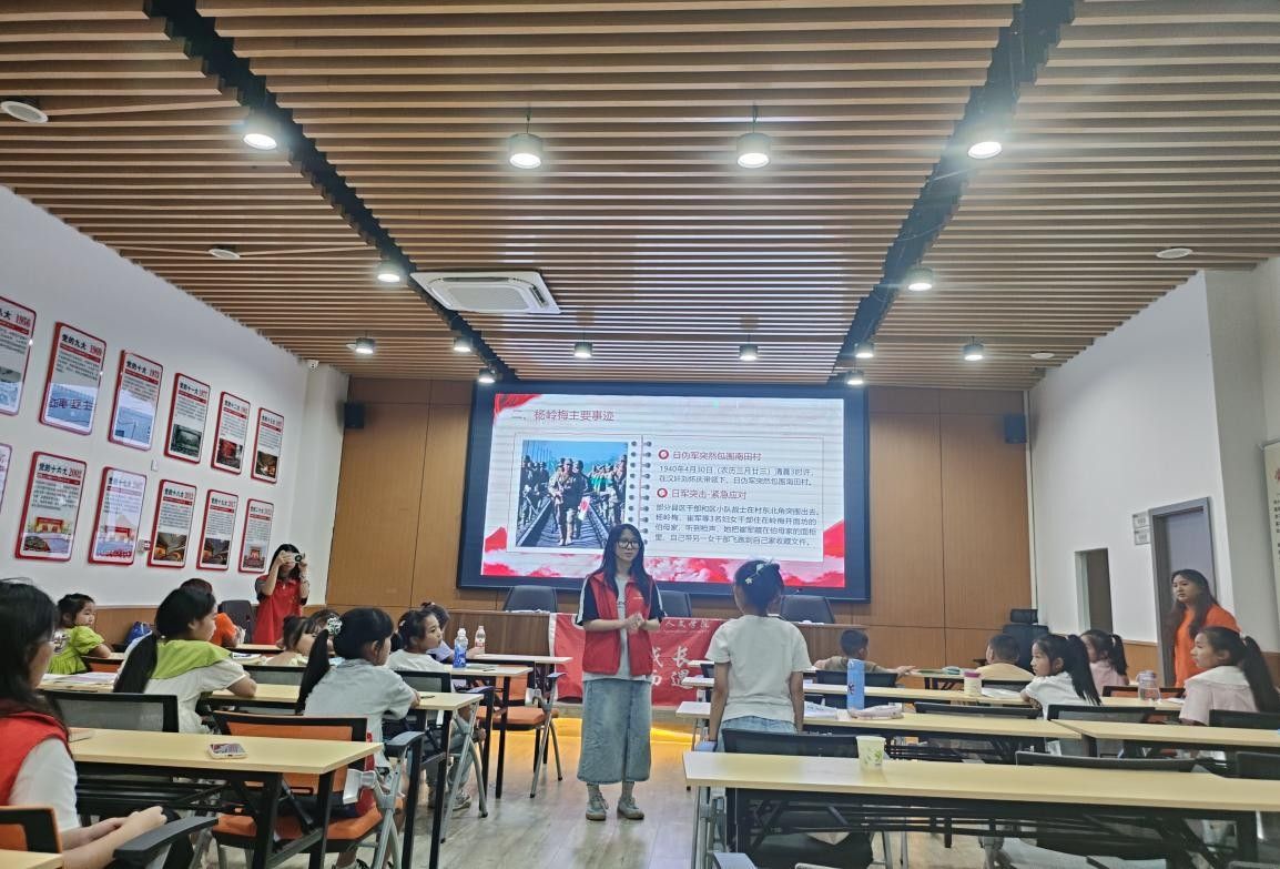 情绪体验的余温未散,实践队员借助精心制作的多媒体课件,深情讲述了抗日女英雄杨岭梅的感人事迹。一幅幅历史图片,一段段英勇故事,清晰勾勒出杨岭梅在严酷斗争中展现的钢铁意志、非凡勇气与磐石般的信念。讲解员以贴近儿童认知的语言,将抽象的“信仰力量”具象化,使小听众们凝神静听,深受震撼,对革命先辈的崇高精神有了更为具象和深刻的认识。