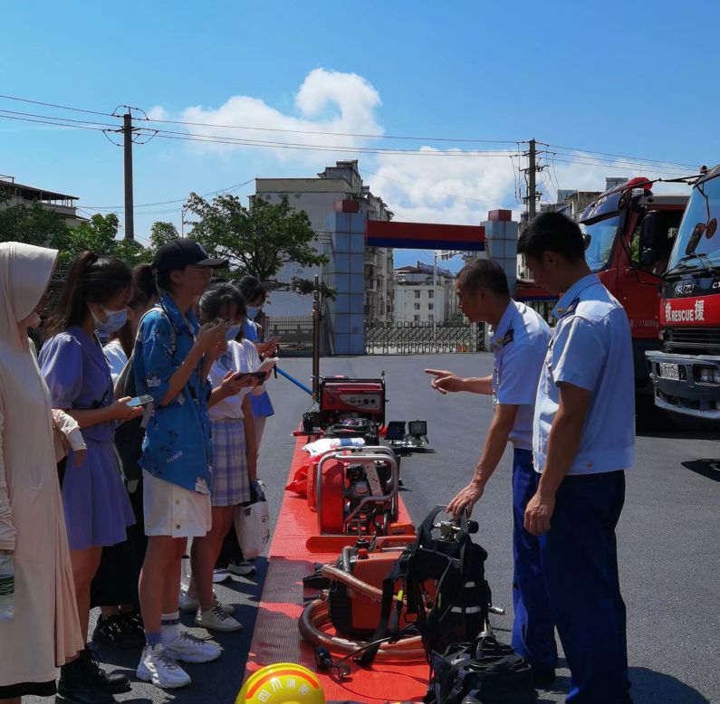 上午11时,团队一行九人在带队教师陈敏的带领下,来到汉源县消防大队进行参观学习。首先,消防队员们为同学们详细演示并讲解了雷达生命探测仪、抛投器等各类消防救援器材的使用方法及注意事项,讲解过程中同学们不时提出问题,与消防队员们展开交流。