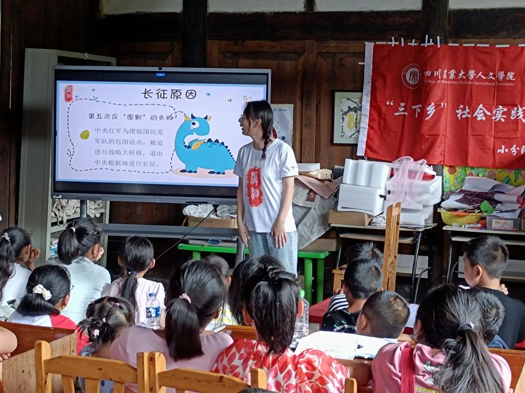 为响应国家号召,助力乡村振兴,传承红色文化,7月16日,太阳成集团tyc234cc溯洄·织英团队4名成员来到了四川省雅安市天全县红岩村,将团队的前期调研成果转化为实践成果,与溯洄·种子团队的6名成员一起为当地的孩子们带来一堂不一样的红色长征文化课程。