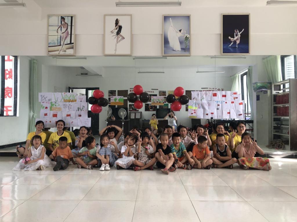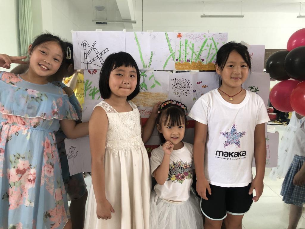 此次结营仪式以小朋友们在夏令营期间的作品展示作为开端。团队成员将小朋友们绘制的以“我心中的党”为主题的绘画作品以及以“梅兰竹菊四君子”为主题的绘画作品一一粘贴在舞蹈室的玻璃墙上,缀以一些彩色小气球,布置成了一面绘画作品展示墙。小朋友们在欣赏了自己和他人的画作后,分别在展示墙前与自己的画作合影留念,用相机记录下自己在夏令营里的学习成果。