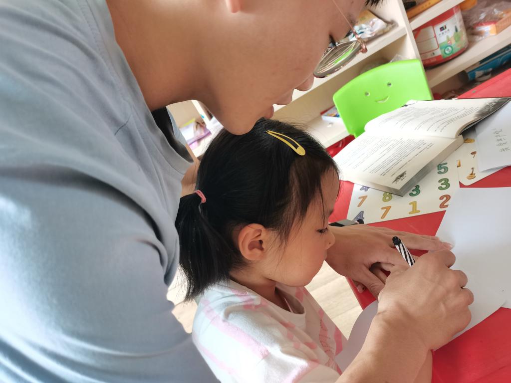 绘画结束后,志愿者经过商讨,决定教小朋友写“我爱共产党”这句话以达到更深刻领会红色精神的目的。在志愿者范林虎的悉心指导下,小朋友们跟随志愿者一笔一划地进行模仿,最后在小朋友自己的努力下写下了完整的一句话。课程结束时,他们拿着自己的作品与志愿者合影留念。