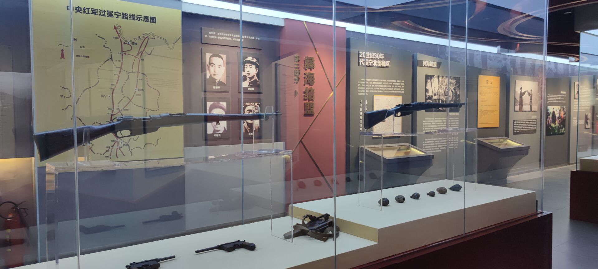 走进纪念馆,团队成员杨比玛看到了各种记载资料。其中不乏对刘伯承、罗炳辉等著名人物的介绍,对长征途中发生的有纪念意义的故事的讲述,例如护旗故事等。此外,馆内所展示的雕塑、墙上的壁画让团队成员杨比玛有机会一睹革命先烈当年风采:巧渡金沙江、沪沽后卫反击战等事件以文字的方式重现;纪念馆陈设的枪支、大刀、红军外出证章和红军用过的水壶、算盘让人联想到了红军当时的生活状况。这些珍贵的文物,见证了当时那段富有传奇色彩的汉彝民族团结的历史。