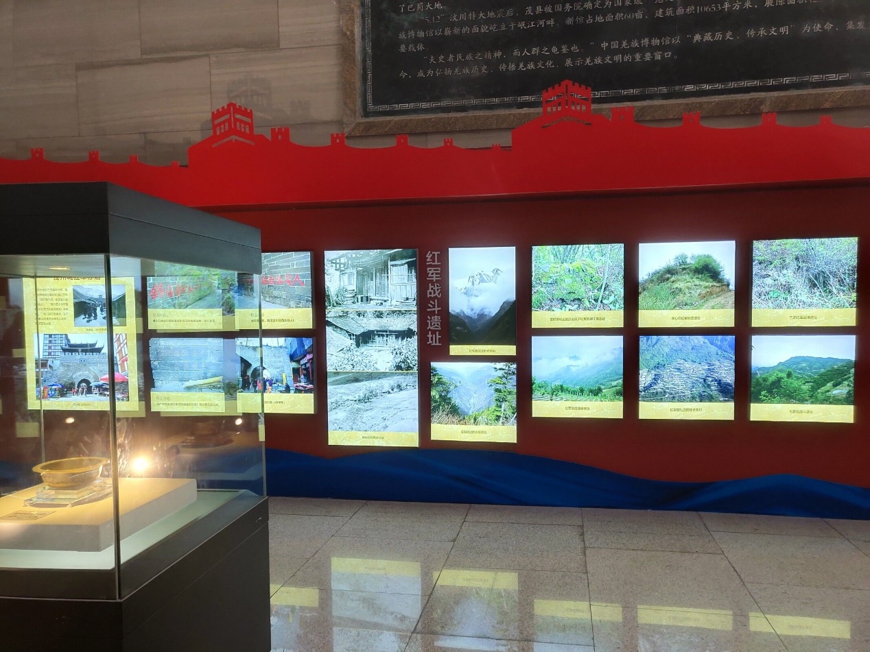 羌族博物馆更留下了红军长征的痕迹,顺着长廊,团队参观了展出的红军留下的苏维埃钱币、文稿、石刻标语,枪支以及羌民收藏的红军军事教材、红军卫生公司教材等珍贵文物。更深处,羌族服饰和工艺品向团队展示了羌族建筑、艺术、婚姻、民俗、宗教等多个方面及其文化特色。