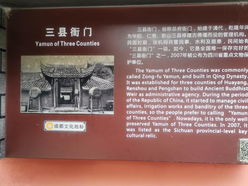 工作人员还称:“三县衙门历史、文化、艺术价值,对发展黄龙溪的旅游事业有积极作用。当地有关部门在“三县衙门”原址上开辟了一个黄龙溪出土文物、民俗文物展览,衙门内放着许多古代公堂用具,如狗头铡刀、刑具、官服等。整修后,将作为官德培训基地,倡导廉政建设。”