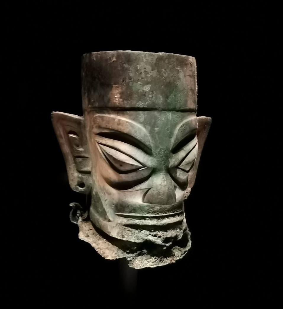 青铜面具栗眉大眼,高鼻阔口,体现出王巫合一,人神一体的古蜀文化,反映出了古蜀先民的原始宗教意识,也形象说明了古蜀先民的群体关系。